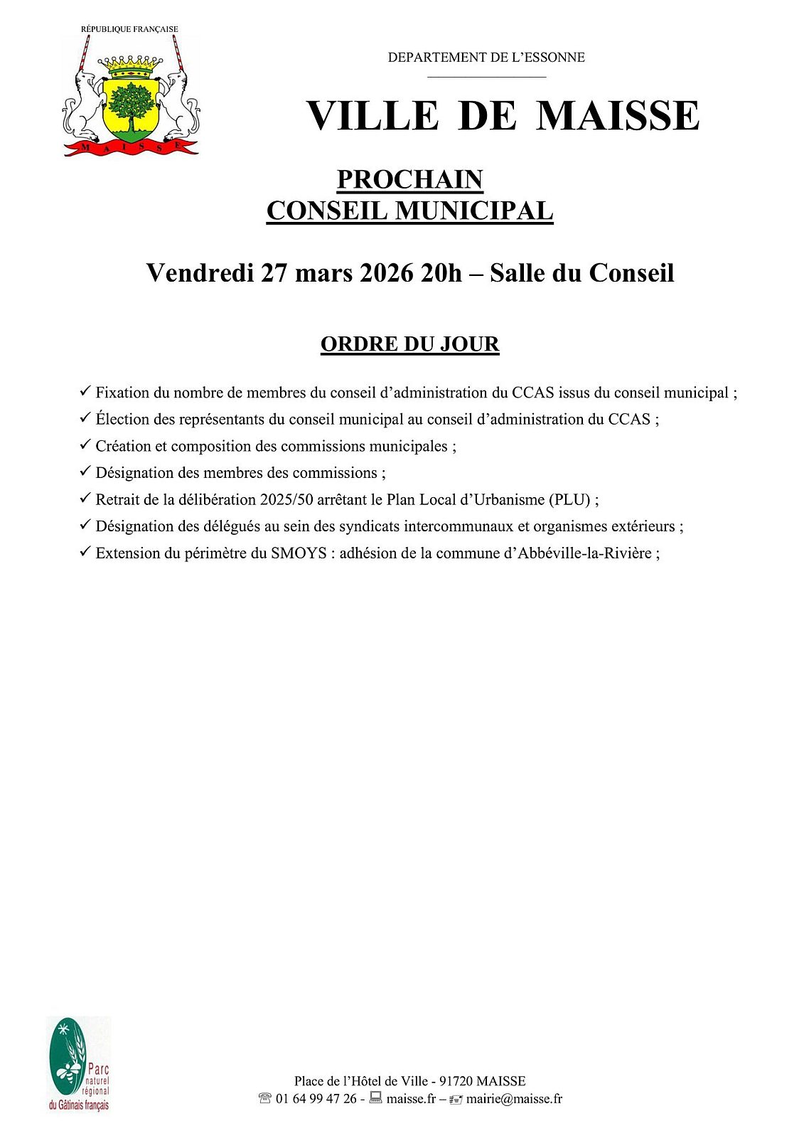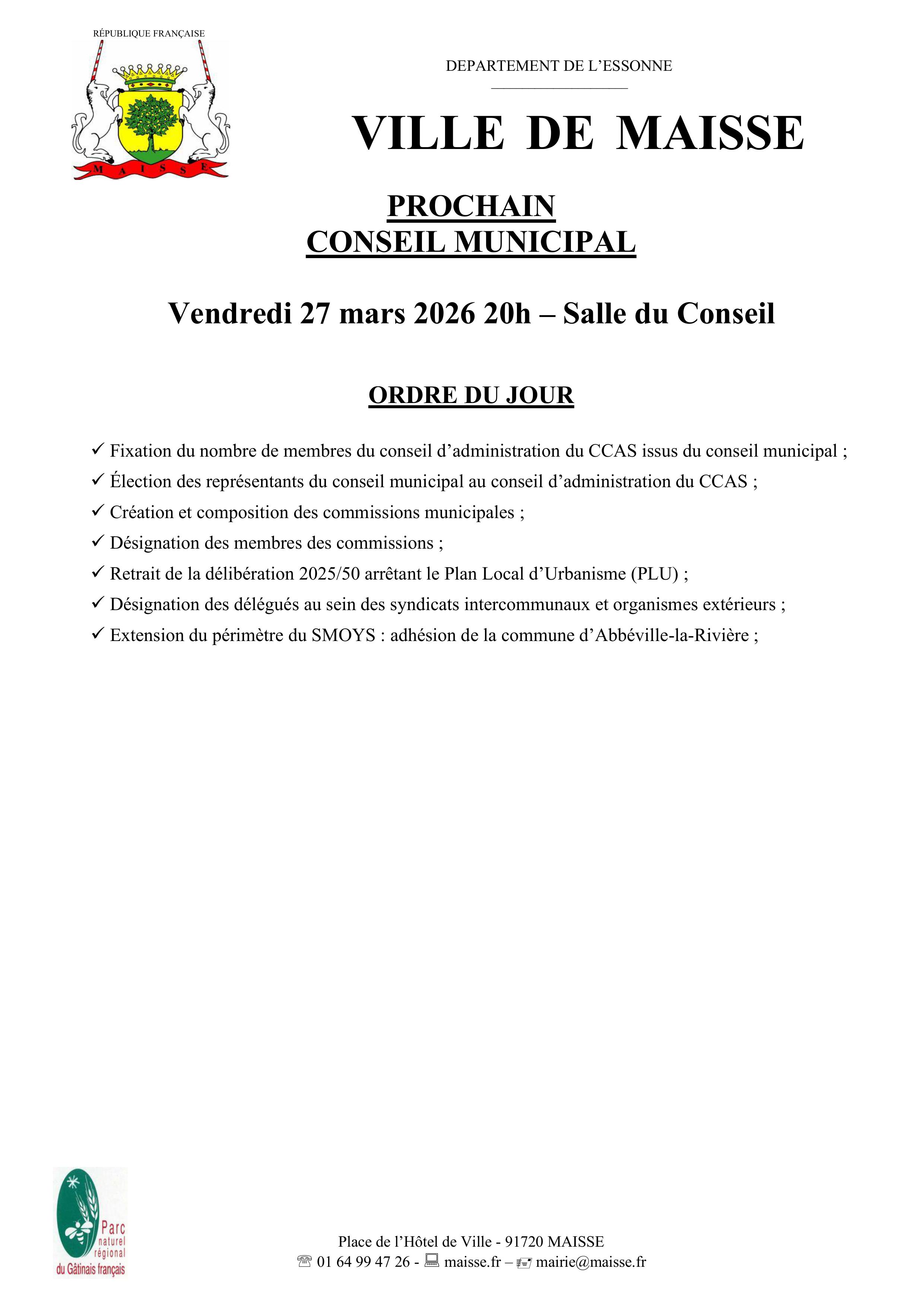 Prochain Conseil Municipal : vendredi 27 mars à 20h